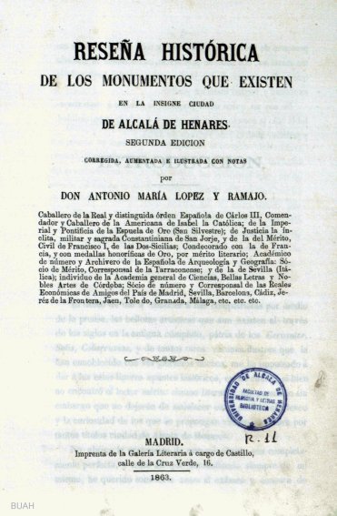 La obra de Antonio María López Ramajo, por el contrario, es una monografía escrita para dar a conocer a los españoles las bellezas artísticas que aún existen en Alcalá, tal como explica el autor en el prólogo de la segunda edición. Anterior en cinco años al libro de Palou y en veintiuno al de Acosta, fue publicada por vez primera en 1861 con el título de Breve descripción de las cosas más notables que existen en la insigne ciudad de Alcalá de Henares (Madrid, 1861, Imprenta y Estereotipia Española), siendo reeditada dos años más tarde, notablemente ampliada, como Reseña histórica de los monumentos que existen en la insigne ciudad de Alcalá de Henares (Madrid, 1863, Imprenta de la Galería Literaria).