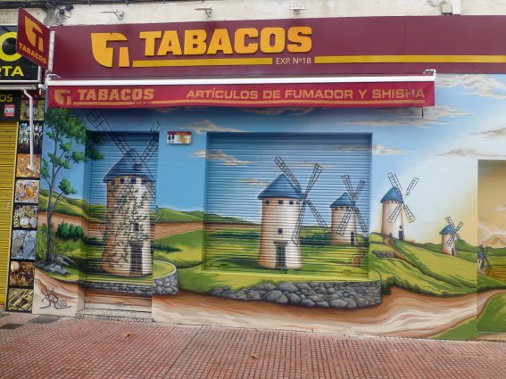 En 2025 decoró en el barrio de la Tabla Pintora las dos fachadas del estanco situado en la confluencia de las calles Río Manzanares y Río Alberche, dedicando a la segunda un motivo complutense por lo que lo consideraremos en el artículo correspondiente, y a la de Río Manzanares uno cervantino y más concretamente quijotesco, con una representación idealizada del paisaje manchego con los emblemáticos molinos de viento, junto a Don Quijote y Sancho cabalgando en sus respectivas monturas.