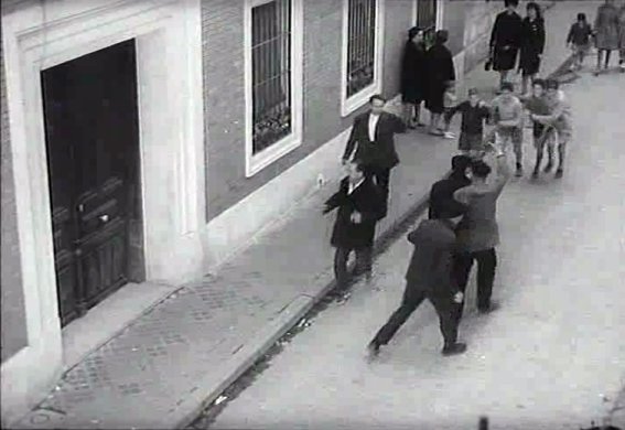 Es una lástima que no se aprecien otros lugares cercanos -el plano de la escena de la conversación, como los de la mayor parte de la película, es muy cerrado- que hubieran facilitado la identificación: la otra esquina de la calle de Esteban Azaña, con un jardín que persiste aunque el edificio actual es moderno; la otra acera de ese tramo de la calle Nueva correspondiente a la fachada lateral del antiguo colegio de Lugo, donde en mi infancia se encontraba un concesionario de bombonas de butano: el rincón formado por la trasera de éste y la fachada de la Mutual Complutense, e incluso una vista del otro tramo de la calle Nueva hasta su confluencia con la calle Mayor. En cualquier caso no existe posibilidad de error, e incluso se aprecia brevemente la esquina trasera que forma el colegio de Lugo, incluyendo el borde de una entrada de garaje que todavía se conserva.
