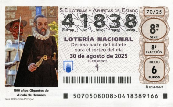El sorteo del 30 de agosto de 2025 estuvo dedicado a los gigantes alcalaínos, veintiséis años después de que aparecieran en un cupón de la ONCE. En esta ocasión el motivo de su protagonismo fue el quinto centenario de su existencia o, dicho con mayor precisión, de la primera mención en un documento histórico, por lo que la fecha real de su aparición podría ser incluso más antigua.