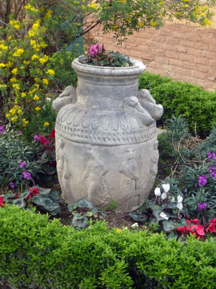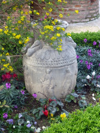 En el parque ODonnell, junto a la caseta del pozo que suministra -o suministraba hasta que el Ayuntamiento tropezó con la kafkiana burocracia de la CHT- agua de riego al parque, se encuentra este jarrón réplica de los originales romanos. Aunque está directamente colocado sobre el suelo sirviendo de improvisada jardinera, lo que no ayuda a su contemplación, todo parece indicar que pudiera proceder de algún otro lugar, ignoro si en el mismo parque o fuera de él. En cualquier caso, merecería trasladarlo a otra ubicación en la que resultara más visible.
