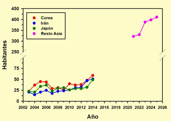 Por su parte, éstos son los datos de población de los tres países restantes, junto al apartado genérico de Otros países de Asia, con el inconveniente ya comentado hasta la saciedad de las series incompletas que impiden hacer estudios comparativos.