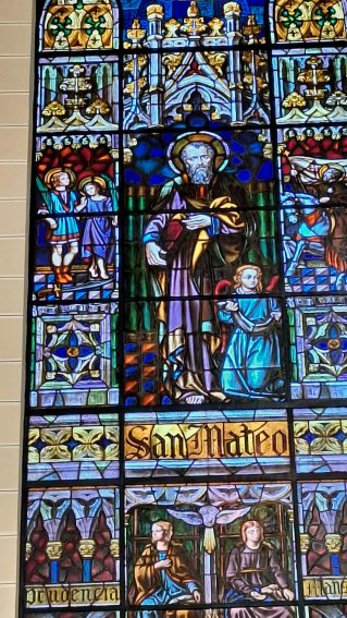 La vidriera situada a la izquierda de las dos existentes en el lado del Evangelio -el lado izquierdo teniendo de frente el altar mayor- está dedicada a san Mateo. Bajo el evangelista se encuentran las alegorías de dos virtudes, y a su izquierda los Santos Niños. Su representación es la habitual: dos niños ataviados con túnicas romanas, corta la de Pastor y larga la de Justo, portando ambos las palmas del martirio. A sus pies aparece una espada símbolo de su degollación, y bajo ésta una cartela recoge sus nombres.
