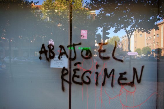 En cuanto a su mensaje, éste no puede ser más escueto: Abajo el régimen, lo cual me plantea una duda casi metafísica. ¿A qué régimen se puede referir? En tiempos de Franco no había dudas, el Régimen -así, con mayúsculas- era la dictadura franquista, con lo cual todos -incluso los policías- sabíamos perfectamente a qué se refería el anónimo autor de la pintada. Pero ahora...
