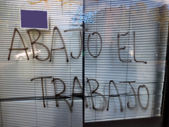 El otro día, paseando por mi barrio, me encontré con la pintada que ilustra este comentario realizada sobre el escaparate de una antigua sucursal bancaria, hoy cerrada. Y me sorprendió bastante, esa es la verdad, ya que las otrora florecientes pintadas políticas de los tiempos de la Transición son hoy prácticamente inexistentes, al menos en el ámbito en el que yo me muevo, sustituidas eso sí por esas omnipresentes gamberradas -por llamarlas algo suave- que algunos se empeñan en elevar a la categoría de arte urbano y que yo sólo veo como una manera garrula de guarrear las paredes.