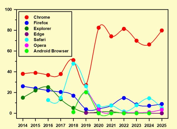 La pugna entre los tres grandes -al menos en teoría- se mantuvo en 2022, con Chrome afianzando su dominio y Firefox casi duplicando su porcentaje, aunque sin conseguir alcanzar el 15 %, mientras Microsoft continuaba su descalabro con tan sólo un 1 % conseguido por Edge. En 2023 se mantuvo esta correlación de fuerzas, aunque con un descenso significado tanto en Crhome como todavía más acusado en Firefox, hundiéndose los dos navegadores de Microsoft a un rotundo cero. Esta situación continuó en 2024, con ligeros descensos de Chrome y Firefox respecto al año anterior y de nuevo valores nulos para los navegadores de Microsoft; y si bien lo de Explorer se entiende puesto que ha desaparecido de las nuevas versiones de Windows, lo de Edge no salvo asumiendo que se trata de un fracaso de Microsoft, ya que las encuestas a nivel mundial que he consultado no le suelen dar más allá de un 5 % del total. En 2025 Chrome acaparó prácticamente el 80 % de las visitas a costa de Safari, mientras Firefox se mantenía recuperando lo perdido en los dos últimos años y Edge repetía su descalabro.