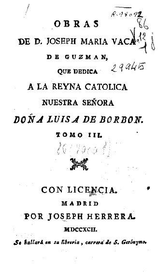 Es por ello por lo que estimé conveniente recordar su figura y su obra centrándome principalmente en una poesía muy curiosa que reproduciré en su totalidad; pero antes de ello conviene, no obstante, esbozar su biografía, hecho éste difícil ya que son muy pocos los datos que he podido encontrar sobre la misma. José María Vaca de Guzmán-Manrique Herdocia Guzmán-Paredes y Pisón, que éste era su nombre completo, nació en la localidad sevillana de Marchena el 5 de abril de 1744, falleciendo hacia el año 1803. Cursó sus estudios en Sevilla y en Alcalá, matriculándose en nuestra ciudad en el colegio menor de Santiago o de los caballeros Manriques, uno de los más aristocráticos de la universidad complutense, el cual estaba reservado exclusivamente a los miembros de esta noble familia castellana. Situado en la calle de los Colegios justo a continuación del colegio de Santo Tomás, la antigua cárcel, hoy no queda prácticamente nada de este edificio a excepción de algunos restos irreconocibles de su antigua fachada, convertidos en una anónima tapia.