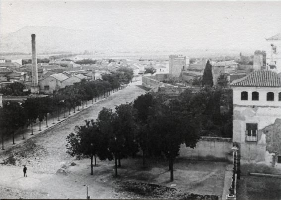 Concluyo el artículo con la ya citada chimenea de la fábrica de mostaza de Tito Molina, de la cual lo único que he podido averiguar es que estuvo ubicada al final del paseo del Val, frente al antiguo campo de fútbol y en la zona delimitada por éste, el paseo de la Alameda y la entonces inexistente calle Sevilla, aunque según se aprecia en las fotos pudo existir un camino o una entrada particular coincidente con el trazado de esta última. Pese a que debió de alcanzar una relativa importancia no he conseguido averiguar ni el momento de su apertura ni el de su cierre, quizás posterior a la Guerra Civil. Asimismo el único dato gráfico de que dispongo es la fotografía de una de las latas donde se envasaba la mostaza, en la que aparece un dibujo representándola con el inconfundible perfil del Malvecino y los cerros al fondo.