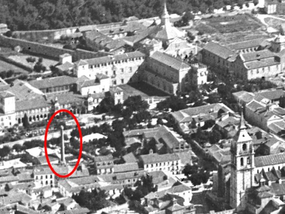 Y también una tercera, en este caso una fotografía aérea de Alcalá tomada en 1932, en la que la chimenea se distingue perfectamente dado que no se trata de una fotografía cenital en la que se pierde la perspectiva, sino que está tomada a baja altura y en un ángulo que permite apreciar los detalles.