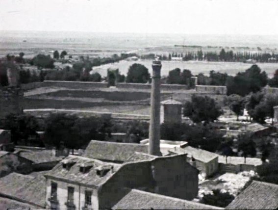 Por último, he extraído este fotograma del documental Ciudades castellanas, Alcalá de Henares, rodado en 1935. La secuencia a la que pertenece fue tomada desde la torre de la Catedral-Magistral, por lo que la combinación de la cercanía y la perspectiva nos proporciona una vista de la chimenea con mayor detalle que las fotografías anteriores.