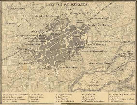 Por esta razón, si comparamos un plano de Alcalá en la época clásica de la Universidad (siglos XVI-XVII) con otro de mediados del siglo XIX apenas notaríamos diferencias excepto en algunos detalles. La mayor parte de los edificios de la ciudad se encontraban dentro del recinto amurallado heredado de la Baja Edad Media, que se extendía desde la Puerta de Madrid hasta la de Mártires (Cuatro Caños) siguiendo por el norte la actual Vía Complutense y recorriendo por el sur el paseo de los Curas hasta la Puerta del Vado, para continuar desde allí por la ronda de la Pescadería y Carmen Descalzo hasta salir a la Puerta de Aguadores, cerrando el anillo por la calle Azucena.