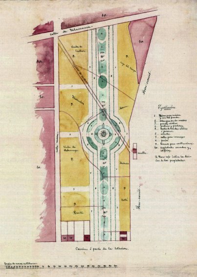 Manuel Vicente Sánchez Moltó recoge en su trabajo dedicado a la llegada del ferrocarril un plano de 1858, contemporáneo a la llegada de éste, en el que se representa el proyecto de construcción de un paseo arbolado, con una glorieta central rematada por una fuente ornamental, que discurriría paralelo a la vía férrea y a Cánovas del Castillo desde la calle de Torrelaguna -entonces de Talamanca- hasta el paseo de la Estación, aproximadamente sobre las actuales calles Ferrocarril, Infantado, Muelle y Huertas. Huelga decir que no sólo el proyecto no se llevó a cabo sino que la especulación urbanística de la segunda mitad del siglo XIX llevó las viviendas hasta el mismo borde de las vías, impidiendo la construcción de una calle que sirviera de frontera entre ambas al tiempo que creaba unas innecesarias molestias a los vecinos.