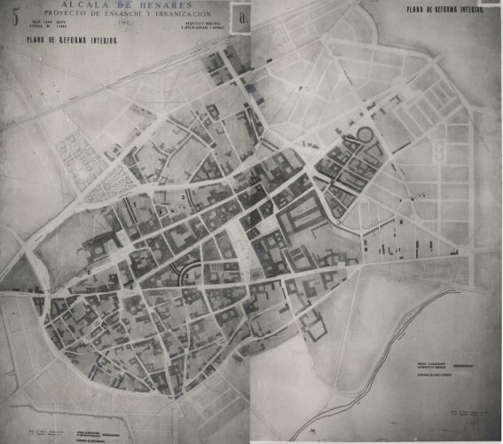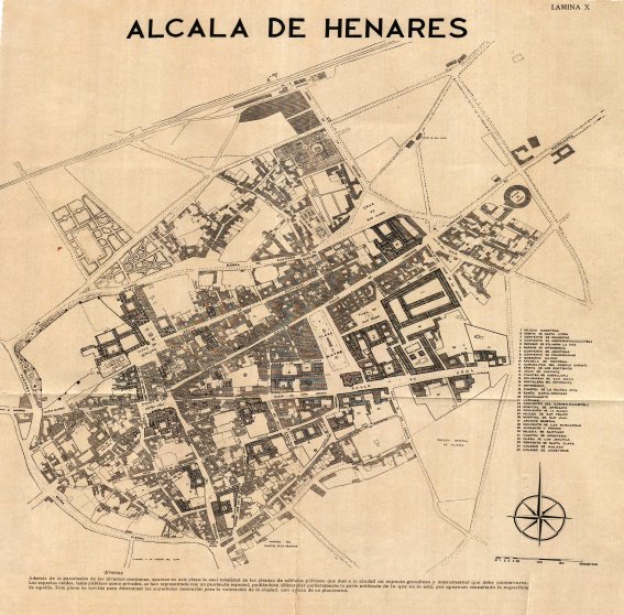 En lo que respecta al crecimiento del casco urbano de Alcalá disponemos, para el primer tercio del siglo XX, de dos documentos gráficos importantes. El primero es un plano, aparentemente una actualización del parcelario de 1870, incluido en el libro Análisis de Alcalá de Henares. Estudio de las poblaciones españolas de más de 20.000 habitantes (I)1. Aunque el libro fue publicado en 1948 el plano es claramente anterior incluso a la Guerra Civil, puesto que en él aparecen intactos edificios que quedaron destruidos en ella como la antigua parroquia de Santa María o inmediatamente después como el Palacio Arzobispal; incluso las calles cuyos nombres fueron cambiados por el régimen franquista figuran con sus denominaciones tradicionales. Puesto que también está representado el espolón que sobresalía de la fachada del colegio de Jesuitas al final de la calle Libreros, disponemos de una referencia que permite asignar al plano una fecha igual o anterior a 1928, pues fue éste el año en el que el espolón fue demolido. El segundo es una fotografía aérea tomada en 1938, en plena Guerra Civil, por un avión de la Legión Cóndor durante un vuelo de reconocimiento.