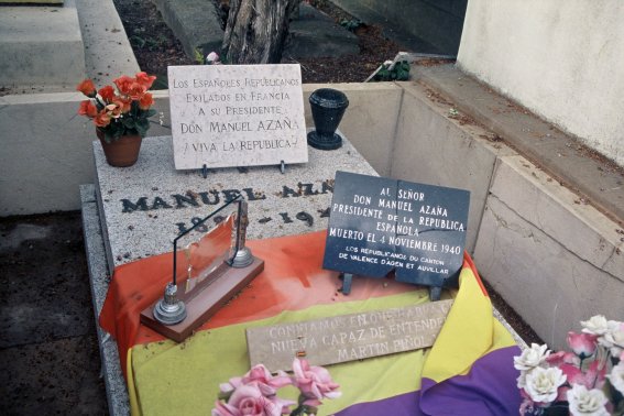 Azaña, como es sabido, fue abandonado, cuando no atacado, por la mayoría de los dirigentes de la moribunda República, pasando el último año y medio de su vida enfermo y acosado por los agentes franquistas en su exilio francés, falleciendo finalmente tras un largo y amargo peregrinaje en la ciudad de Montauban el 3 de noviembre de 1940. Allí fue enterrado en una discreta tumba que en nada se diferencia de las del resto del camposanto, y allí sigue estando todavía hoy, en cumplimiento de su deseo de no ser movido de allá donde cayera.