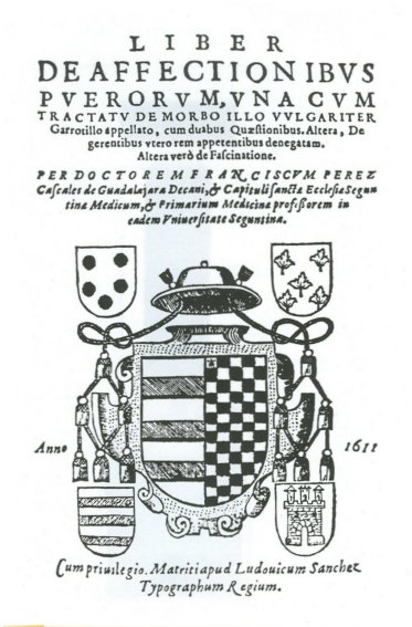 Hasta aquí, la biografía de Francisco Pérez Cascales no se diferencia demasiado de la de otros muchos estudiantes de la universidad alcalaína. Sin embargo, hay un factor que hace que este personaje haya pasado por méritos propios a la historia de la medicina española: La publicación en 1611 de un tratado sobre las enfermedades infantiles, una de las más importantes aportaciones españolas a la literatura pediátrica de su época. El libro, un volumen en octavo de casi trescientas páginas, tiene el larguísimo título en latín de Liber de affectionibus puerorum, una cum tractatu de morbo illo vulgariter Garrotillo appellato, cum duabus Quaestionibus. Altera, De gerentibus vtero rem appetentibus denegatam. Altera vero de Fascinatione. Está impreso en Madrid, en la imprenta del tipógrafo real Luis Sánchez, y está dedicado a don Antonio Venegas Figueroa, entonces obispo electo de Sigüenza, prelado cuyo escudo de armas constituye la portada del libro.