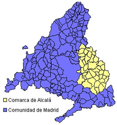 Era normal que Alcalá recordara a los pueblos de la comarca en su callejero, a los cuales tiene dedicadas calles, fundamentalmente, por la zona del Campo del Ángel, el Chorrillo y la parte baja del Ensanche, en los aledaños de la avenida de la Alcarria. Es preciso aclarar, no obstante, que sus límites han variado a lo largo del tiempo, por lo que por comarca de Alcalá entiendo tanto el territorio medieval como el más amplio -aunque algo amputado por el sur- del partido judicial creado en el siglo XIX. No considero, por tratarse de circunscripciones efímeras, algunos territorios pertenecientes en la actualidad a la provincia de Guadalajara, en ocasiones bastante alejados de la ciudad y sin vínculos reales con la misma.