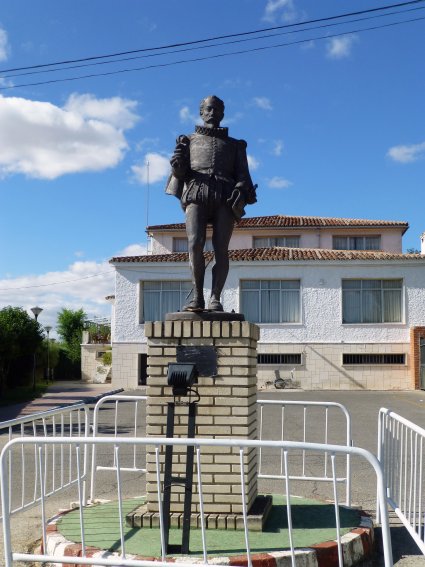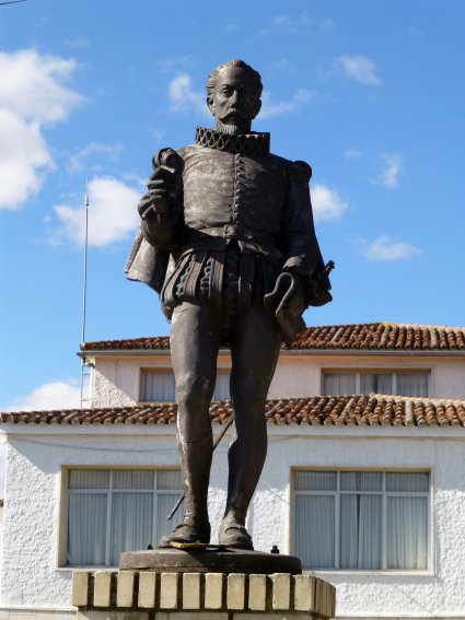En concreto tengo localizadas cuatro estatuas que cumplen estas condiciones. La más conocida de todas ellas es, obviamente, la de la plaza de Cervantes. Fundida en bronce por el escultor florentino Carlo Nicoli, su inauguración tuvo lugar el 9 de octubre de 1879, siendo alcalde de Alcalá Esteban Azaña. El pedestal, tallado en piedra de Colmenar por Manuel Laredo, fue sustituido por el actual a finales de la década de 1970, añadiéndosele en 1994 los relieves de sus cuatro caras realizados por Pepe Noja. La estatua, que había sufrido las inclemencias del tiempo durante más de 125 años así como varios actos vandálicos, fue restaurada en 2007, reponiéndosele la pluma que había sido robada varias veces por los vándalos y sustituida más tarde por una tosca reproducción a todas luces inadecuada.