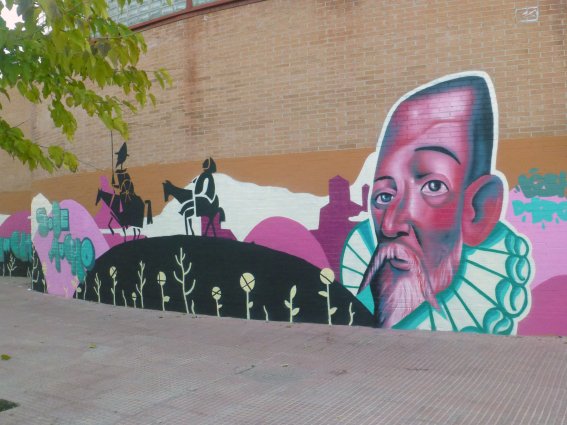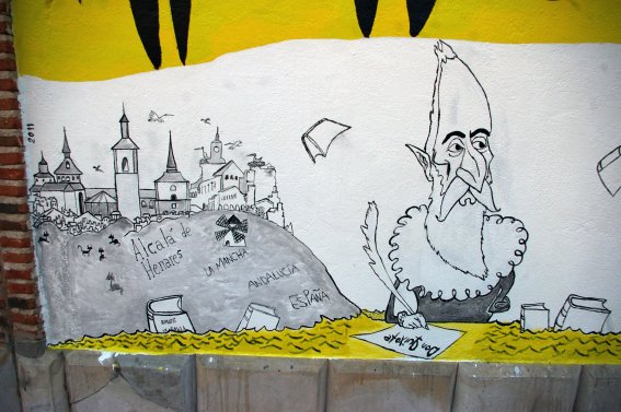 El colegio Miguel de Cervantes, situado en la calle Giner de los Ríos, es uno de los más antiguos de Alcalá ya que fue fundado en 1953, aunque el edificio actual data de la década de 1990. Dado su nombre no era de extrañar que contara con algún tipo de homenaje al autor del Quijote, algo que efectivamente ocurre con el grafiti pintado en uno de los muros del patio, que retrata al autor acompañado por las siluetas de sus personajes inmortales junto con un nutrido grupo de molinos de viento.