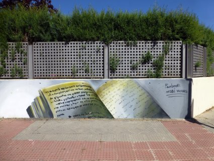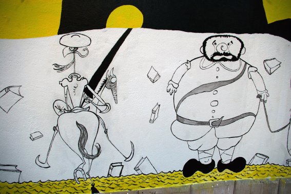 Las dimensiones y el formato del grafiti hacen imposible fotografiarlo por completo incluso en formato panorámico, a lo que se une la dificultad añadida de la estrechez de la acera parcialmente invadida, por si fuera todavía poco, por los coches aparcados. Así pues me vi obligado a trocearlo entresacando para este artículo las partes más significativas del mismo, el cual termina con la imagen de un niño leyendo y, a modo de telón, el pergamino inicial de El Príncipe de los Ingenios que cierra el círculo justo donde éste empezó.
