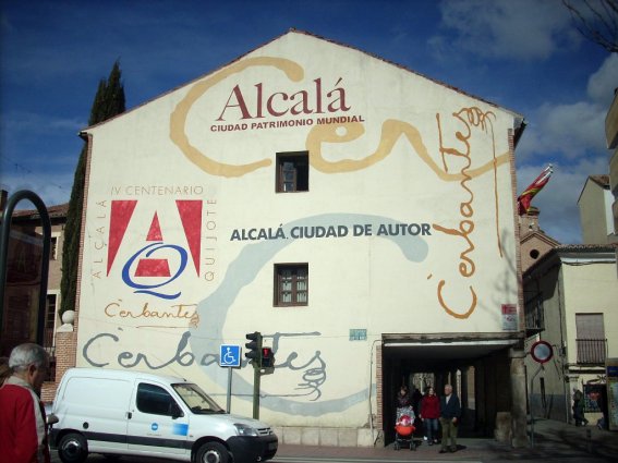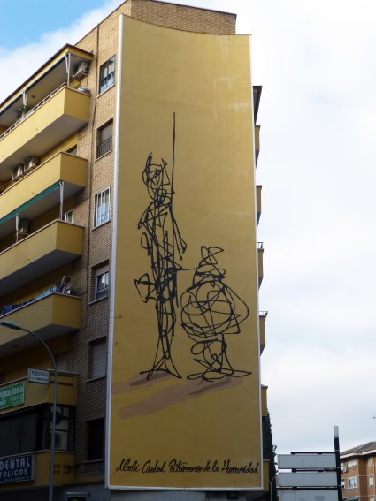 Finalmente la Casa Tapón no se llegó a demoler pero la medianería permaneció durante mucho tiempo sin decoración alguna, ya que no fue sino hasta hace relativamente poco cuando el Ayuntamiento decidió decorarla con un mural. Dado el carácter efímero de este tipo de pinturas han sido varios los grafitis que la han decorado, siendo el primero de ellos, si no me falla la memoria, uno de Modesto Quijada que representaba a unos gatos riñendo al cual, lamentablemente, no le hice ninguna fotografía. Tampoco tuve la precaución de hacerlo con el que le sucedió, por lo que he tenido que recurrir a una foto publicada en marzo de 2009 en el blog rutastranquilas, lo cual he de agradecer a su autora MariaRosa. Como se puede comprobar no se trata estrictamente de un grafiti cervantino ya que, con un diseño estilizado, mezcla las referencias a Alcalá con la celebración del IV centenario del Quijote, lo que permite datarlo en 2005.