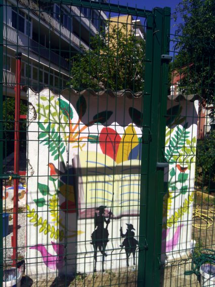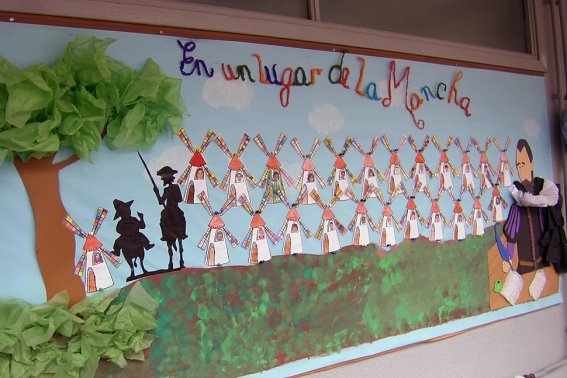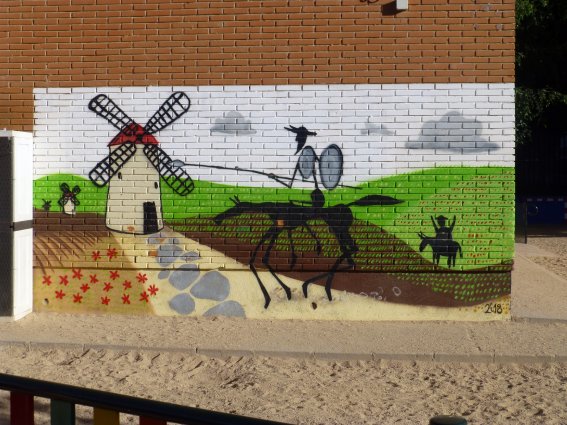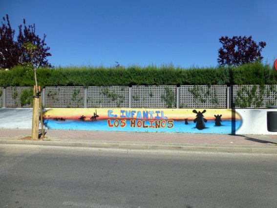 También municipal, aunque gestionada por la sociedad cooperativa Jiménez de Cisneros, es la escuela infantil Los Molinos, la cual se encuentra en el barrio de Espartales, concretamente en la calle de José Martínez Ruiz Azorín junto a la parroquia de Santo Tomás de Villanueva. Este centro fue inaugurado en 2005, pero desconozco la fecha en la que fue pintado el mural que decora el zócalo de su valla externa ya que éste no está fechado, aunque sí firmado por Mobi Works. Debido a la forma del zócalo el mural es alargado y estrecho, y cuenta con tres partes. El motivo central reproduce el nombre de la escuela sobre un fondo típico cervantino, con las siluetas de Don Quijote y Sancho Panza a un lado y los molinos de la célebre aventura que le dan nombre al otro. Éste está flanqueado a su vez por otros dos laterales de menor tamaño, a la izquierda una representación de la portada del Quijote, y a la derecha el libro abierto precisamente por el episodio de los molinos, junto con la citada firma.