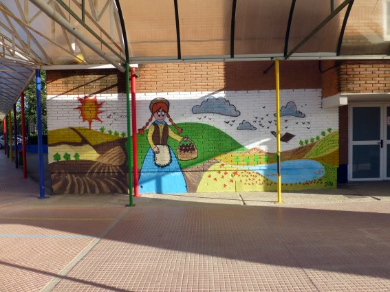 Puesto que no me ha sido posible acceder al interior del colegio dispongo tan sólo de una fotografía que he tomado de su página web, lo que me impide conocer el autor y la fecha en que fue ejecutado, si es que estos datos figuran en él, así como la técnica utilizada en su realización ya que parece tratarse no de un grafiti pintado sino más bien de algún tipo de collage, aunque nada puedo confirmar al respecto.