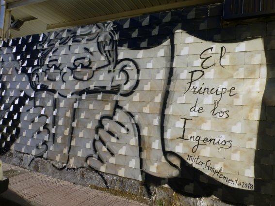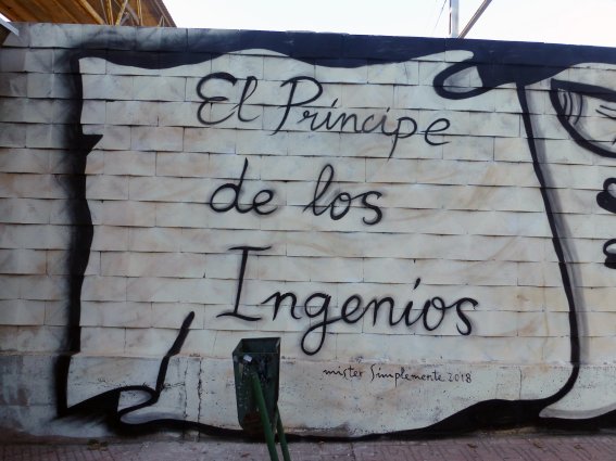 El conjunto de los grafitis cervantinos que podemos encontrar en Alcalá se puede clasificar en dos grupos, dependiendo que se trate de iniciativas institucionales o particulares. Por esta razón, y para facilitar su estudio, he considerado conveniente abordarlos por separado en diferentes artículos, uno dedicado a los primeros, otro a los particulares1 y un tercero a los también particulares de los que es autor el prolífico muralista Rubén Bernao2.