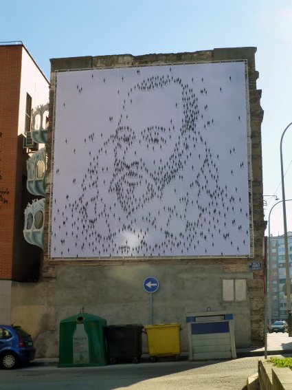 Apenas unas semanas más tarde, en enero de 2018, un segundo grafiti de Suso33 se sumó a los anteriores elevando su número a cinco. Está ubicado en la calle de Andrés Llorente sobre la medianería trasera de la antigua fábrica de harinas de la calle Daoíz y Velarde, lo que le proporciona una magnífica visibilidad desde los vehículos que atraviesan el puente de la carretera de Daganzo en dirección al centro de Alcalá. El mural reproduce el famoso retrato apócrifo de Juan de Jaúregui, con la particularidad de que está realizado a base de un puntillismo monocromático en el que los puntos que definen el dibujo son en su totalidad pequeñas siluetas humanas. El dibujo se complementa con tres falsos balcones que recuerdan claramente a la obra de Gaudí. Es una lástima que los contenedores de basura situados bajo el mural afeen su innegable calidad artística.