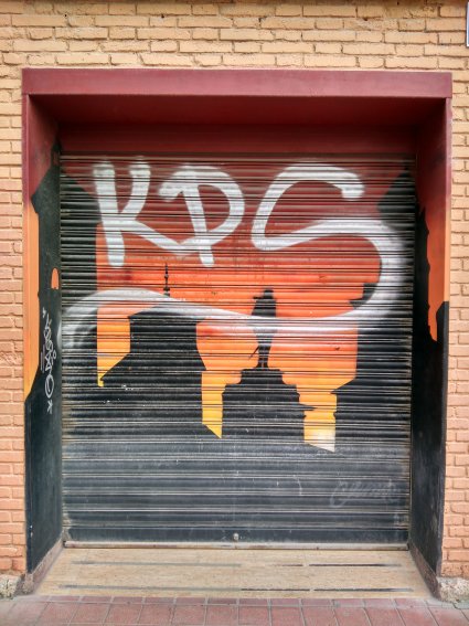 Aunque cuando hice la fotografía ya estaba vandalizado, acabaría siendo destrozado por completo. Esto motivó que los responsables del centro encargaran la ejecución de uno nuevo que abarcó no sólo el cierre de la puerta sino también todo el lienzo de la fachada que lo rodea por ambos lados, representando un perfil panorámico de las siluetas más representativas de Alcalá. Su autor también reprodujo la estatua de Cervantes, aunque en esta ocasión no en el cierre sino fuera de éste, en el muro vecino. Lamentablemente los vándalos parecen empeñados en seguir perpetrando sus desmanes, por lo que cabe temer que este grafiti acabe teniendo el mismo destino que su predecesor.
