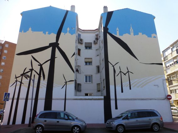 Ya a finales de abril de 2018 el artista alcalaíno Manu Cardiel decoró las medianerías que dan a la plaza, todavía sin nombre, construida sobre lo que fuera el antiguo campo de fútbol de la colonia de Mazzoni, al final de la calle Torrelaguna. Son dos edificios separados por la calle Gurugú, pero como ambos cuentan con un patio de luces fueron cuatro las fachadas sobre las que trabajó este artista, que aprovechó todo el conjunto para dedicárselo a un único episodio del Quijote, la conocida aventura de los molinos de viento. En la parte derecha vemos a Don Quijote, caballero sobre Rocinante y con la lanza enristrada, acometer sobre los que él cree gigantes, mientras en la izquierda aparecen los molinos convertidos en generadores eólicos, un curioso recurso para enlazar la época del Quijote con la nuestra. A modo de guiño, sobre las siluetas de los aerogeneradores se perfila la conocida silueta de los principales monumentos alcalaínos incluyendo, claro está, a la estatua de Cervantes.