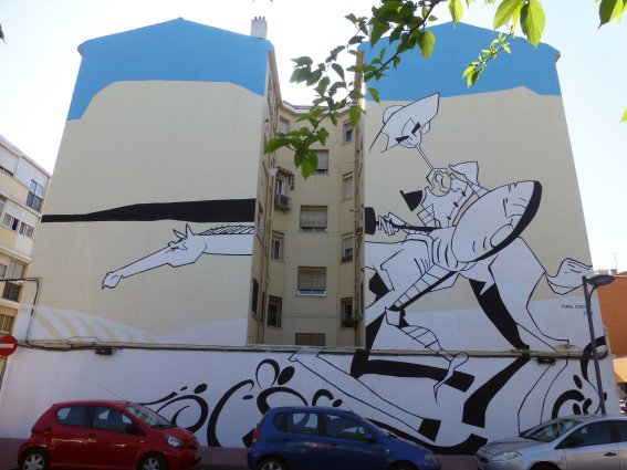 El colegio Dulcinea, situado en el camino de Teatinos junto al barrio de los Nogales, cuenta desde 2018 con dos grafitis pintados en una de las paredes que dan al patio. Como cabía esperar están dedicados a la propia Dulcinea, representada en un estilo claramente naif, y al conocido episodio de los molinos, desde mi punto de vista con una estética más interesante.