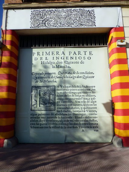 El mural, pintado en vivos tonos amarillos y negros, representa con un estilo muy peculiar la aventura de los molinos, mientras en la parte baja, ya en blanco y negro y a modo de cómic, nos encontramos con un recorrido entre Alcalá, representada por Cervantes, y Azul, con don Quijote y Sancho atravesando simbólicamente el océano. De momento, los vándalos lo han respetado...
