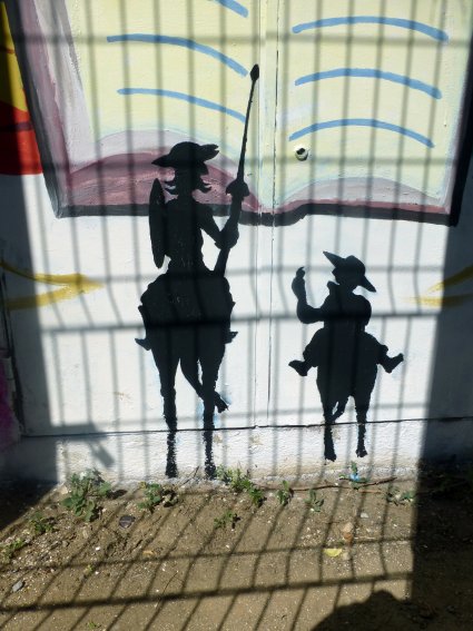 En las postrimerías del curso 2020-21 los alumnos del instituto Pedro Gumiel, bajo la supervisión de varios profesores, decoraron con grafitis el huerto que habían sembrado en el patio del centro docente. Aunque la mayoría de los motivos eran alusivos a esta temática, en una pequeña caseta existente en el interior del recinto representaron las inconfundibles siluetas de Don Quijote y Sancho Panza frente a un libro abierto.