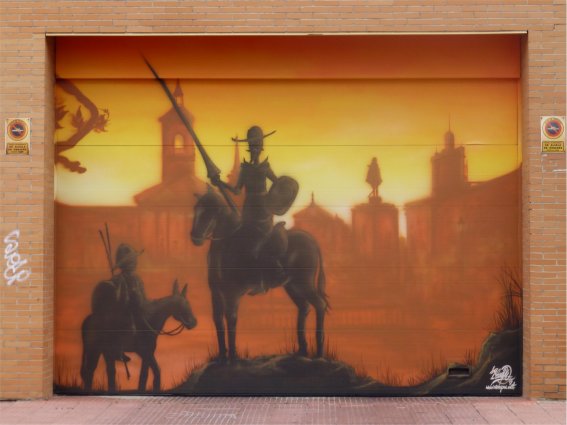 Otro muralista profesional, Campu, es el autor del grafiti que decora una puerta de garaje de la calle Belvis de Jarama. Fechado en 2015, representa a las figuras ecuestres de Don Quijote y Sancho sobre el conocido perfil de la plaza de Cervantes incluyendo la estatua de su creador, lo que le confiere un especial simbolismo al vincular a nuestra ciudad con la obra literaria más universal. Tras una reparación de la puerta que sustituyó parte de las lamas por otras muevas el grafiti se perdió parcialmente.