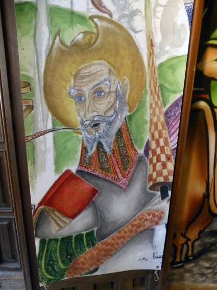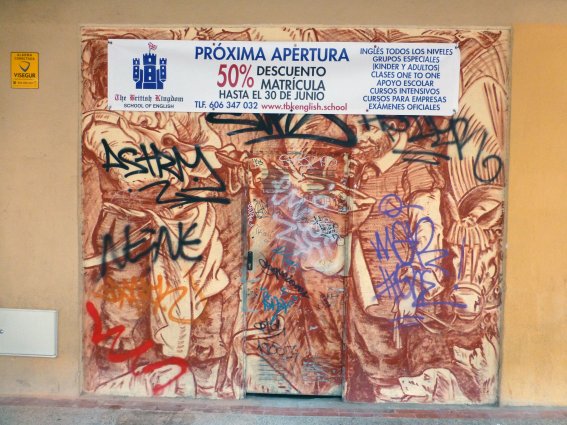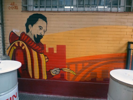Cerca de allí, en el barrio de Reyes Católicos, nos encontramos con este retrato de Cervantes pintado en el cierre de la puerta trasera de la galería comercial León que da acceso al muelle de carga. Dado su grado de deterioro es de suponer que sea antiguo, y como curiosidad cabe reseñar que aparece rodeado por varios productos alimenticios.
