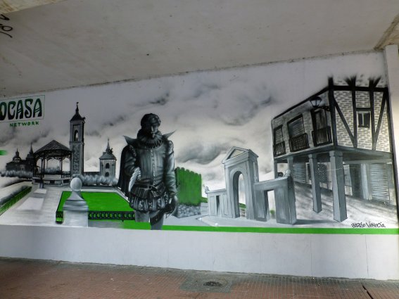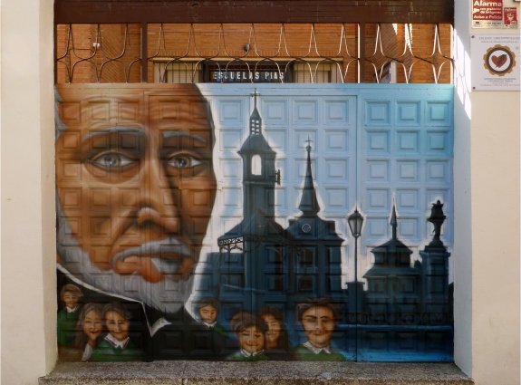 Un perfil de la ciudad con las siluetas del entorno de la plaza de Cervantes, incluyendo la de la estatua de nuestro escritor, aparecía como fondo, acompañando a la imagen de san José de Calasanz y a las de varios alumnos, en uno de los grafitis -el único de temática alcalaína- que decoraban las puertas de entrada del colegio de los Escolapios, en la avenida de Lope de Figueroa. Tras una remodelación de la puerta, el grafiti desapareció.