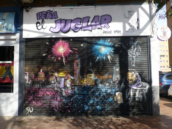 El grafiti que adorna el cierre del local de la peña El Juglar, situado en uno de los locales de la galería comercial Boisán con fachada a la calle Fernán Falcón, reproduce una alegoría de las fiestas de Alcalá centrada en la plaza de Cervantes, por lo cual aparece representada su estatua en la panorámica general y una segunda vez, en esta ocasión, en primer plano, en la esquina superior derecha de la composición.