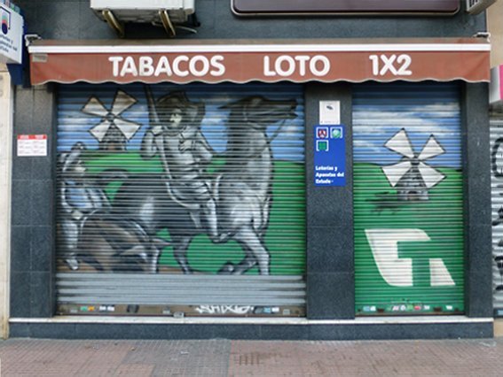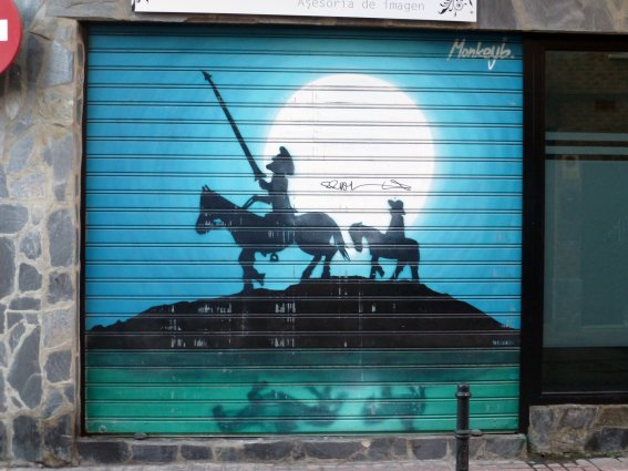 Muy cerca de allí, en la calle Infantado, los cierres metálicos de un estanco reproducen, partida en dos por el muro que separa el escaparate de la puerta, la escena quijotesca por antonomasia, Don Quijote y Sancho cabalgando entre molinos de viento. Lamentablemente la reparación de varias lamas en la parte baja del cierre principal causó la desaparición parcial del dibujo y, quizá también, la fecha y la firma de su autor, con lo por no puedo aportar ningún dado al respecto.