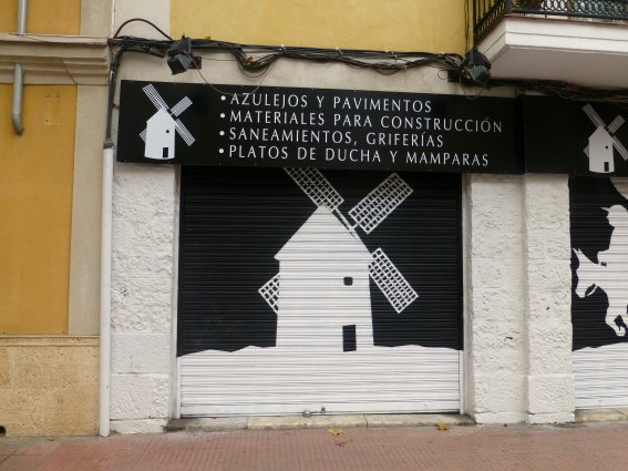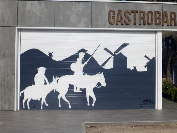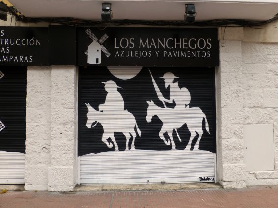 Ya en la vecina avenida de Guadalajara los dos cierres de un establecimiento dedicado a la venta de saneamientos y materiales de construcción hacen honor a su nombre de Los Manchegos con un doble grafiti, sobriamente pintado en blanco y negro, donde se aprecian las siluetas de Don Quijote y Sancho Panza, ambos sobre sus respectivas monturas, caminando hacia un molino de viento. Su autor -aunque la pintura de las letras está corrida y no se puede leer bien- firmó como Jabón en 2017.