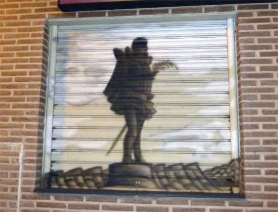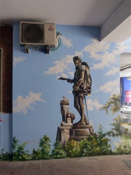 Aquí lo que nos interesa es la parte que representa a la estatua de Cervantes, ya que el conjunto del grafiti está reproducido y comentado en el artículo correspondiente. Como puede comprobarse, tanto la estatua y la espadaña están ejecutadas con una minuciosa técnica realista; es una lástima que el aparato de aire acondicionado lo estropee, pero cabe suponer que estuviera allí antes.