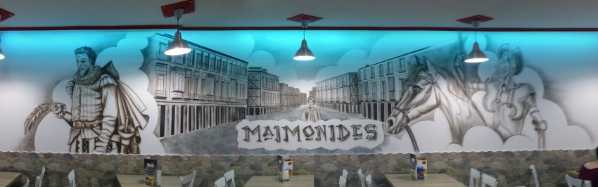 Firmado por ScAMEZ, este espectacular mural decoraba una pared interior del restaurante Maimónides, que se encontraba situado en el número 45 de la calle Mayor. Como puede comprobarse, representaba una vista panorámica de la calle Mayor, donde se encontraba este establecimiento, con un motivo central formado por el nombre del restaurante y la figura de este importante personaje judío de la España medieval. A ambos lados aparecían, a la izquierda, la estatua de Cervantes, y a la derecha, Don Quijote cabalgando sobre Rocinante. Lamentablemente el restaurante cerró en el verano de 2018 y el local fue reformado y remodelado por completo para dedicarlo a una actividad comercial distinta un año más tarde, por lo que se le ha de dar por desaparecido.