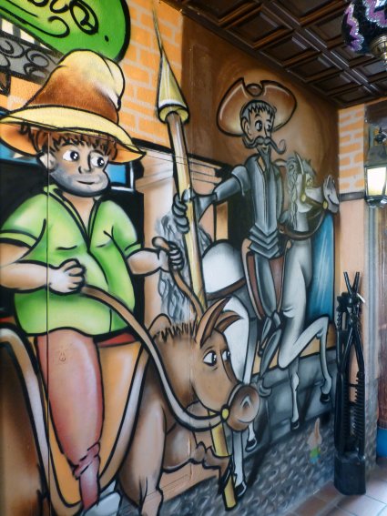 Muy cerca de allí, en el número 51 de la calle Mayor, nos encontramos con este simpático grafiti que representa una imagen infantil de Don Quijote y Sancho Panza con los soportales al fondo. Se encuentra en el interior de la tienda de recuerdos La Casa de Don Quijote y, más concretamente, en la galería por la que se entra a ella, con toda probabilidad un antiguo adarve medieval de los muchos por los que se accedía al interior de las viviendas cuando la calle era el núcleo del barrio judío. Complementa la decoración cervantina un lienzo, o lona, representando a Don Quijote.