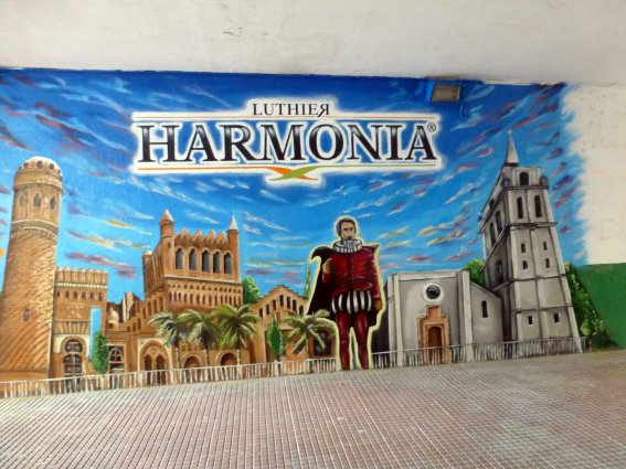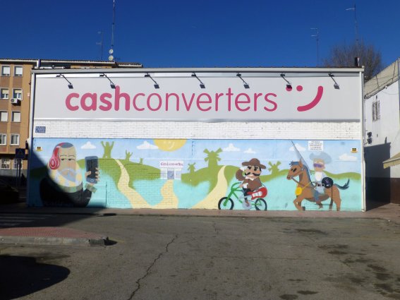 Sin abandonar el barrio de Reyes Católicos podemos contemplar un gran grafiti que ocupa la totalidad de la pared trasera de un comercio. Se encuentra en la plaza de Rodrigo de Triana esquina a la calle Gardenia, y su divertido diseño es un claro tributo al cómic con Cervantes a un lado oyendo música en el teléfono móvil con unos auriculares, y al otro Sancho Panza en bicicleta con una guitarra eléctrica y Don Quijote con gafas de sol y un disco de vinilo por adarga. Al fondo, un paisaje que recuerda el episodio de los molinos y, entre molinos y gigantes, la entrada de la tienda.