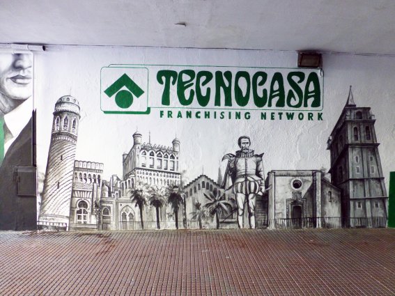 Un año antes, en 2017, la misma agencia inmobiliaria había promovido una iniciativa similar en la pared del pasaje que comunica a la calle Noria con la de Torrelaguna, donde tenía abierta otra sucursal. Panorámico al igual que el anterior y también pintado en negro y verde, reproducía asimismo un collage de elementos alcalaínos en los que la estatua de Cervantes estaba flanqueada por la Catedral-Magistral y el Hotel Laredo, apreciándose al fondo un edificio de difícil identificación que no parecía pertenecer a Alcalá. El grafiti se complementaba con una silueta masculina parcialmente cortada en un plano muy cinematográfico, en cuyo brazo aparecía la firma del autor: Luis Camacaro.