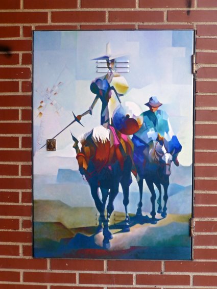 En el cercano paseo de los Curas, concretamente en el zaguán del portal del número 8, nos encontramos con esta original representación de Don Quijote y Sancho Panza pintada sobre la tapa metálica de un registro, lamentablemente anónima y sin fecha de ejecución.