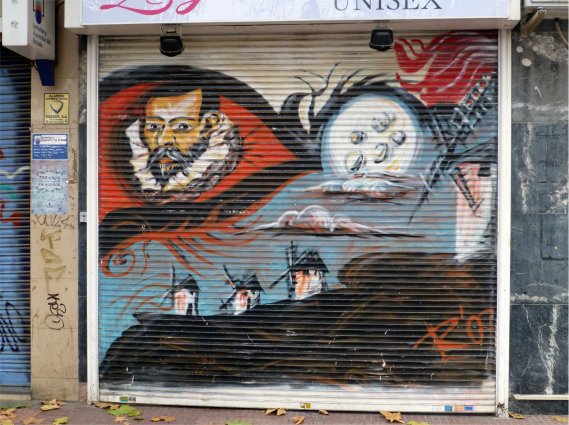 En primer lugar nos encontramos con esta representación cervantina en la que se combinan un retrato de nuestro escritor con un paisaje jalonado de molinos de viento, curiosamente carente de los personajes del Quijote. El grafiti decora el cierre metálico de una peluquería de la calle Torrelaguna y, dado que según la firma fue pintado en 2007, nos encontramos frente a un caso singular de permanencia dentro de un arte tan efímero, aunque sí se notan en él las huellas del inevitable desgaste.