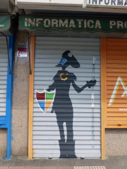 Menos convencional es el grafiti que decora el cierre de una tienda de informática situada en la Vía Complutense, no muy lejos de su confluencia con la calle Luis de Medina. En él, nos encontramos con una silueta estilizada del Quijote a la que se le han añadido varios elementos tales como la máscara teatral que simboliza la dualidad de la comedia y la tragedia, o un escudo inspirado en el logotipo de una conocida multinacional informática. El resultado es original y curioso.