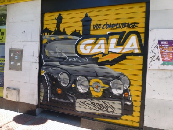 En el número 47 de la Vía Complutense el cierre de una autoescuela combina el dibujo de un coche, icono de su actividad, con un perfil de la plaza de Cervantes, incluyendo el de la estatua que la preside. Aunque la firma de su autor aparece en la matrícula del coche, no me ha sido posible identificarlo.