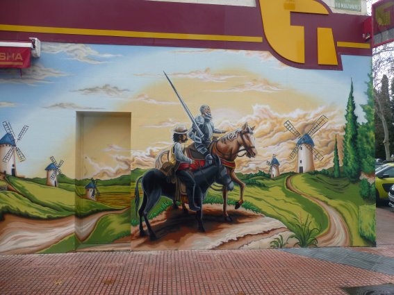 En 2018 realizó otro de sus trípticos aprovechando la puerta y las paredes laterales del garaje situado en el número 2 de la calle Goya. El motivo en esta ocasión es quijotesco, con Don Quijote y Sancho Panza cabalgando sobre sus respectivas monturas en un paisaje típicamente manchego, con los molinos a un lado y la conocida escena del Caballero de la Triste Figura atacando a uno de los que él creía gigantes, al otro.