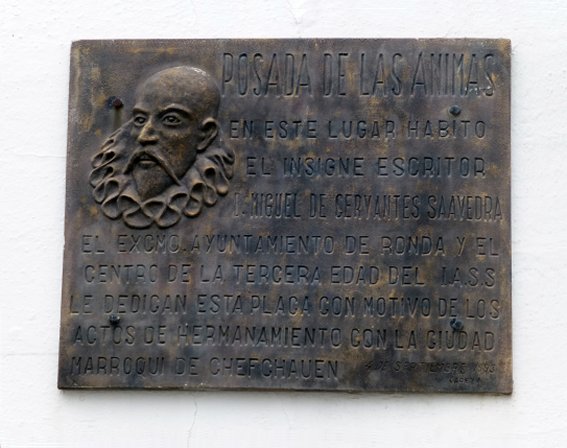 Hace unas semanas, durante un viaje que realicé a la localidad malagueña de Ronda, me encontré con una inesperada lápida conmemorativa dedicada a Cervantes. Y digo inesperada porque, pese a buscarlo con anterioridad al viaje, yo no había conseguido encontrar referencias acerca de la existencia de algún tipo de homenaje al escritor complutense, por lo cual para mí fue toda una sorpresa toparme literalmente con ella mientras deambulaba por las calles de esta bella población andaluza. Tiempo después descubrí que no era esta lápida el único vestigio cervantino existente en Ronda, pero esto es algo que veremos más adelante.